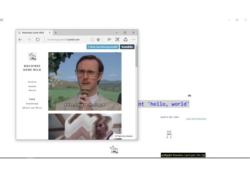 + print “hello, world” + asdfghjkl: #random / prrrt pst / lol / (y) + no eres tu, soy yo + puro fidget + suicidio lento + ca$hier + umbral electrónico + el nuevo negro + los instantes anulados